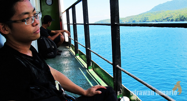 Jadilah kami yang mengantongi dana terbatas ini hanya bisa duduk di emperan kapal beralas lantai besi berkarat, satu-satunya yang dapat disyukuri adalah bedeng peneduh yang sedari tadi menangkal cahaya matahari sore. Fathur duduk diam. Saya membongkar-bongkar halaman demi halaman Lonely Planet sebagai pembunuh kebosanan selama empat jam perjalanan. Kapal ini memang tidak terlampau penuh, namun berisiknya begitu terasa antara bauran suara mesin dan rumpian Bahasa Aceh yang terasa begitu asing di telinga saya.