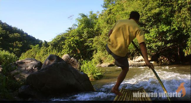 Satu-satunya bambu yang pernah saya naiki hanyalah dipan di teras rumah. Belum pernah terbayangkan bagi saya sebelumnya apabila kemarin saya harus menaiki alas dipan menyusuri sungai di pedalaman Kalimantan. Dengan hanya bermodal batang-batang bambu yang jumlahnya satu lusin, bapak tersebut mengikatnya menjadi satu dan melepasnya pelan-pelan ke tengah jeram.
