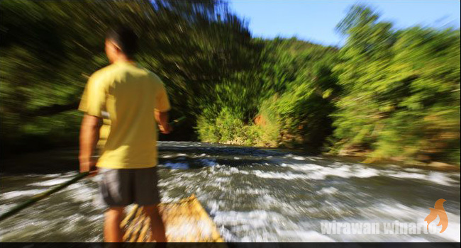 Jangan bicarakan rafting kapal karet yang membakar adrenalin. Perjalanan dengan rakit bambu ini jauh lebih santai, sekaligus lebih was-was, pasalnya : tidak tersedia protokol keamanan. “Pak, apakah bapak dari dulu menaiki bambu seperti ini? Apakah tidak berbahaya?” tanya saya penasaran.