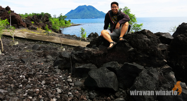 Di sebalik Taman Batu Angus, kita dapat melihat langsung pemandangan Gunung Gamalama yang menjadi induk dari batu-batu ini. Sementara di belakang saya terhampar perairan sempit yang menjembatani antara Pulau Ternate dengan Pulau Hiri, sebuah pulau kerdil yang terletak di sisi utara kepulauan ini.