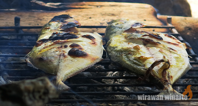“Di pulau ini memang aktivitasnya biasa makan ikan bakar,” celetuk Pak Gatot kepada Novi dan saya. Setumpuk kayu dan dedaunan kering disusun di tepi pantai dan dibakar, kemudian kulit kelapa kering ditimpakan di atasnya. Api pun menjilat-jilat bilahan besi yang ditaruh Rusli di atasnya.