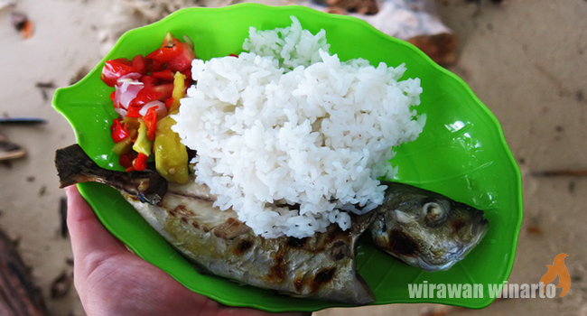 Lama kami berdiskusi hingga tidak terasa pergantian ikan sudah empat kali. Artinya kedelapan ikan semuanya sudah dibakar tuntas. Tinggal menambah potongan cabe, irisan mangga, dan nasi putih maka kami sudah siap untuk makan siang.