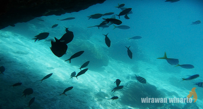 Tidak seberapa masa, air laut menjadi lebih kalem, ataukah memang mata ini sudah beradaptasi dengan lingkungan yang baru. Entahlah. Yang jelas saya mulai bisa melihat pemandangan sekitar yang mana ratusan ribuan ikan menginfes setiap sudut lautan.